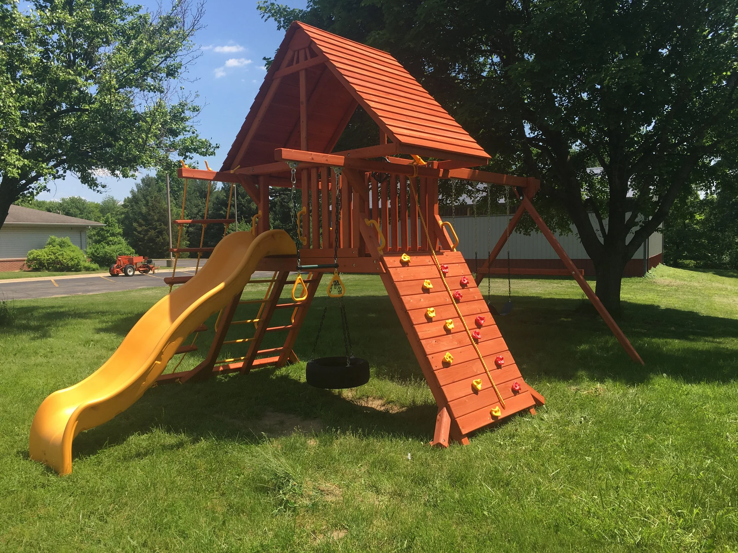 The park has an open air pavilion with 20 picnic tables and three serving tables. It has an asphalt floor and several electrical outlets. There are men’s and women’s restrooms and a swing set for the children.